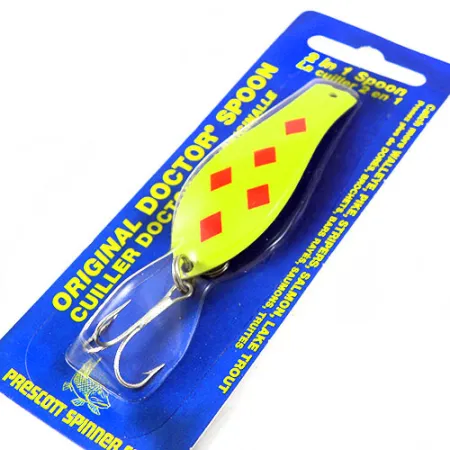 Des losanges rouges contrastent avec la base jaune vif de cette cuillère de 1/3 oz (10 g). Identifiée par le code 0780, la Little Doctor 265 mesure 2 1/2" (6,5 cm) et se trouve dans son emballage d'origine sur carte bleue. Ce spécimen est neuf, préservant l'émail d'usine et l'hameçon triple piquant. Produit par Prescott Spinner, division de la célèbre société Fred Arbogast, ce leurre fabriqué aux États-Unis porte la mention classique « 2 in 1 Spoon » sur sa carte. La finition jaune offre une grande visibilité, tandis que le nom « Doctor Spoon » et la marque sont frappés au dos du métal.
