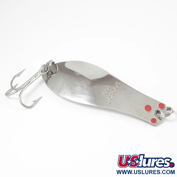 Le placage en nickel de ce corps de 6,5 cm reflète la lumière avec une finition miroir nette, typique des leurres Prescott Spinner de haute qualité. Marquée clairement dans le métal, l'identification « DOCTOR 265 » est accompagnée de trois points rouges distinctifs situés près de l'attache. Pesant 10 g, cette cuillère robuste fabriquée aux États-Unis est conçue pour le lancer ou la traîne. L'armement comprend un hameçon triple piquant et des anneaux brisés doubles, le tout dans un état exceptionnel. Ce spécimen particulier, répertorié sous le code 2584, affiche une note d'état de 5/5, préservant l'éclat du nickel sur tout son profil allongé. La forme classique en goutte d'eau s'affine vers le haut, où le métal est légèrement plus étroit pour accueillir l'attache de la ligne.