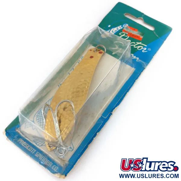 Un plaquage en or martelé recouvre toute la surface de cette cuillère ondulante de 9 cm (3 1/2"), ponctuée de points rouges distinctifs près de l'œillet supérieur. Pesant 21 g (3/4 oz), la Little Doctor 275 est un modèle classique et polyvalent produit par la Prescott Spinner Co., qui a ensuite rejoint la gamme KOTCO Manufacturing à Akron, dans l'Ohio. Ce spécimen particulier, portant le code produit 9748, est conservé dans son emballage blister vintage d'origine. Le leurre lui-même n'a jamais été utilisé, affichant la qualité brillante et réfléchissante de sa finition métallique martelée. La série « Doctor » est réputée pour sa polyvalence bidirectionnelle ; bien qu'équipée ici d'un hameçon triple argenté renforcé à l'extrémité large, la conception permet d'attacher la ligne de chaque côté pour modifier la profondeur et la résistance lors de la traîne ou du lancer. Le dos du carton confirme son utilité pour cibler des espèces plus grandes comme le brochet, le maskinongé et le doré.