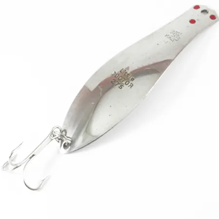Pesant 3/5 oz (16g), cette version spécifique « Thin » du Little Doctor a été conçue pour les applications de traîne où un profil plus léger et plus profilé est préféré aux modèles de lancer plus lourds. La finition en nickel poli est accentuée par trois points rouges distincts positionnés près de l'attache de ligne, un élément de design emblématique de la Prescott Spinner Company de Prescott, Wisconsin. Mesurant 3 1/2" (9 cm) de long, la face de la cuillère est clairement estampillée de la désignation du modèle « Little DOCTOR 27S » ainsi que de l'origine du fabricant. Ce spécimen est en état 5/5, conservant sa surface brillante et réfléchissante et son hameçon triple d'origine de couleur argentée. La conception comprend un anneau brisé à la queue, garantissant que l'armement reste sécurisé pendant les longues sessions de traîne. Fabriqué aux USA, ce leurre représente la simplicité fonctionnelle des articles de pêche vintage du milieu du siècle, utilisant une forme de corps effilée pour atteindre la profondeur prévue sans encombrement excessif. Le dessous présente la même finition en nickel haute brillance, offrant des reflets constants sous plusieurs angles.