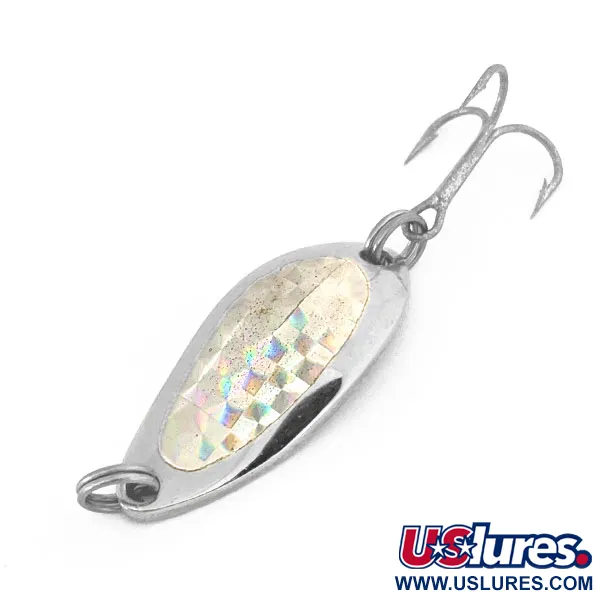 Un placage en nickel caractérise l'extérieur de cette Luhr Jensen 'Little Jewel' (code 11132), une cuillère ondulante vintage hors production depuis de nombreuses années. La marque du fabricant et le poids de 3/16oz (5g) sont clairement estampillés au dos, tandis que la face convexe se distingue par un insert prismatique holographique texturé conçu pour une visibilité accrue. Ce spécimen mesure 1 1/4" (3,3 cm) de long et provient de la période de fabrication américaine de la marque à Hood River, dans l'Oregon. L'armement comprend l'hameçon triple et les anneaux brisés d'origine installés en usine, qui restent brillants et solides. Une note d'état de 5/5 reflète l'état parfaitement préservé de la finition métallique polie et de l'insert prismatique.