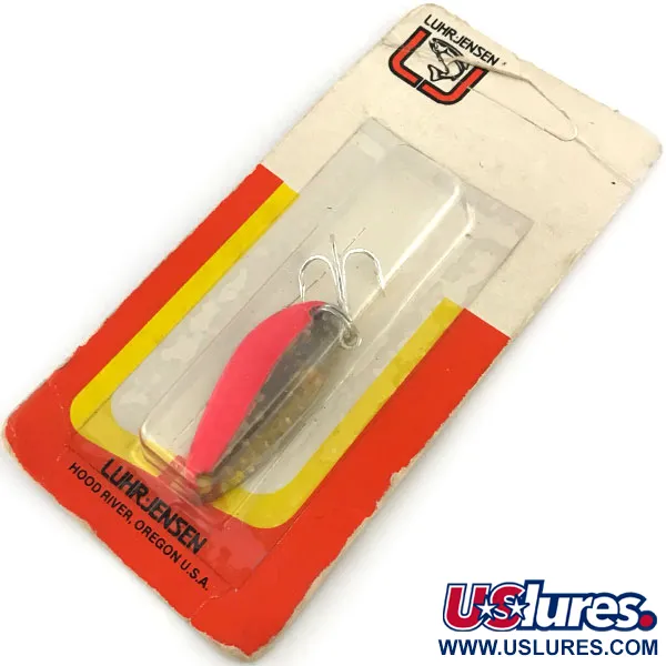 La texture en laiton martelé sur le côté convexe offre une surface hautement réfléchissante qui contraste avec la finition rouge fluorescent éclatante sur la face. Mesurant 1 1/2" (4 cm) et pesant 1/4 oz (7 g), cette cuillère vintage Luhr Jensen Little Jewel est une pièce classique de l'histoire de Hood River, Oregon. Toujours scellée dans son emballage blister d'origine, la cuillère est inutilisée, représentant un état de conservation de niveau 6 pour les collectionneurs. Le dos de la carte conserve l'autocollant original du code-barres avec le code produit 1013-014-399, identifiant spécifiquement ce modèle comme une "Finition Spéciale" fabriquée en 10-94. Conçu pour la polyvalence, le revêtement fluorescent est étudié pour une haute visibilité, réagissant aux rayons UV pour attirer l'attention dans les eaux plus profondes. L'armement se compose d'un hameçon triple argenté brillant et d'un anneau brisé robuste, typiques de la construction durable qui faisait la renommée de Luhr Jensen avant l'arrêt de ce modèle. Ce spécimen constitue un exemple préservé des standards de fabrication du milieu des années 90, du graphisme lithographié de la carte à l'estampage spécifique du métal.