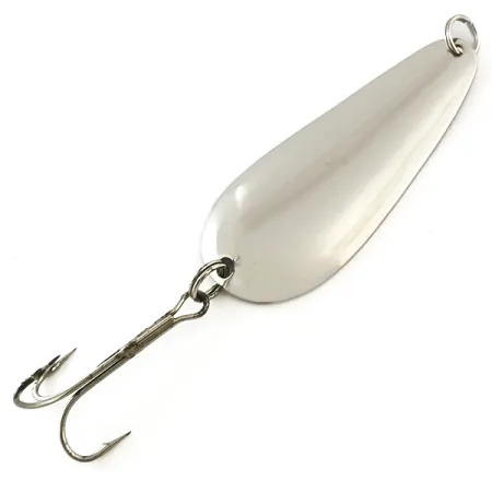 Un placage en nickel recouvre toute la surface de cette cuillère de 7,5 cm (3"), offrant une finition à fort éclat sur laquelle les pêcheurs comptent depuis des décennies. Pesant 17 g (3/5 oz), son corps métallique est suffisamment substantiel pour les lancers à longue distance ou la traîne lorsqu'un profil marqué est nécessaire. Le côté concave présente une estampille claire du nom de la marque, signature de l'héritage Lindy / Little Joe pour le matériel américain fiable fabriqué aux USA. Ce spécimen spécifique, répertorié sous le code 6287, est dans un état 5/5, affichant le lustre brillant et intact d'un leurre parfaitement conservé. L'armement est tout aussi soigné, comprenant un hameçon triple robuste et des anneaux brisés conçus für une utilisation intensive dans divers environnements d'eau douce. Sa forme en goutte d'eau allongée et profilée est un design classique conçu pour capter la lumière sous plusieurs angles, même dans des conditions de profondeur ou d'eaux troubles.