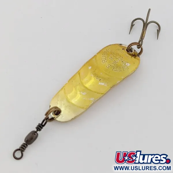 Frappés nettement sur la surface plaquée or, les marquages identifient ce spécimen de 7 g (1/4 oz) comme un design classique du fabricant suédois. La finition dorée reflète la lumière sur un profil ondulé et étagé distinct, doté de trois rainures prononcées conçues pour déplacer l'eau lors d'une récupération linéaire. Sur le côté concave, l'empreinte authentique « LITTLE RUBY RECORD SWEDEN » reste nette et lisible. Un émerillon baril vintage est fixé à l'avant, équilibrant l'hameçon triple au fini bronzé à l'arrière. Cet article particulier, identifié par le code produit 24522, présente une surface bien conservée méritant une note de condition de 4/5. L'intérieur lisse de la cuillère offre un éclat brillant et constant qui complète l'extérieur texturé.