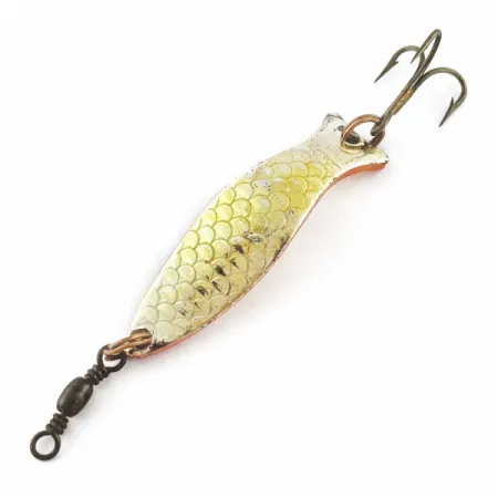 Pesant seulement 1/4 oz (7 g), la surface dorée de cette cuillère est méticuleusement détaillée avec un motif d'écailles pressées. Produite par la marque Record en Suède, la Little Tilly (code produit 24067) présente un profil incurvé élégant rappelant un poisson. Le dessous du corps métallique est peint dans une teinte contrastée rouge-orangé. Elle est équipée d'un émerillon baril sombre à l'avant et d'un hameçon triple piquant à l'arrière. Ce leurre est dans un excellent état 5/5, présentant une armature bien conservée et une finition brillante et réfléchissante.