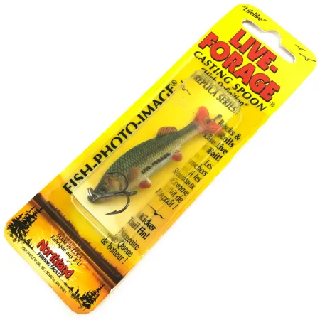 Un fini photo-réaliste « poisson arc-en-ciel » extrêmement détaillé définit ce modèle, utilisant la technologie Fish-Photo-Image de Northland pour imiter les espèces de proies naturelles. Cette cuillère oscillante de 7 g (1/4 oz) de la série Live Forage Replica mesure 6 cm (2 1/4") et est conçue pour le lancer ou la traîne afin de cibler des espèces telles que le sandre, l'achigan et le brochet. Identifié par le code produit 5140, le leurre présente un corps en laiton estampé qui produit un éclat distinct, tandis qu'une nageoire « Kicker Tail Fin » ajoute à son profil visuel. Étant donné que cet article est classé en état 6, il reste inutilisé dans son emballage blister d'origine, préservant ainsi les propriétés phosphorescentes mentionnées dans les spécifications technique. L'armement comprend un seul grand hameçon triple fixé à la partie inférieure du corps de la cuillère.