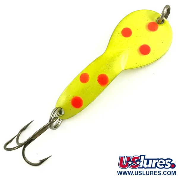 Six points rouges distincts sont précisément positionnés sur la face jaune fluorescente de cette cuiller ondulante Glen Evans Loco 2 UV de 7g (1/4oz). Mesurant 5 cm (2"), ce modèle spécifique présente une finition haute visibilité conçue pour réagir à la lumière ultraviolette, ce qui est particulièrement efficace dans les eaux troubles ou par faible luminosité. Le revers révèle une base en nickel propre estampillée de l'identifiant "LOCO 2" près de l'œillet supérieur. Conçu pour le lancer comme pour la traîne, ce leurre est généralement utilisé pour cibler le brochet dans les eaux calmes à des profondeurs atteignant 1 m (3,3ft). Ce spécimen, répertorié sous le code produit 5790, est dans un état 5/5, la peinture et l'armement ne montrant aucun signe d'utilisation. Des anneaux brisés robustes fixent un hameçon triple piquant à la queue, garantissant que la configuration d'usine originale reste intacte.