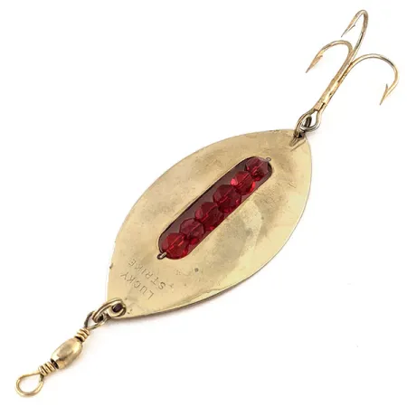 Mesurant 9 cm (3 1/2"), cette cuillère Lucky Strike de fabrication canadienne présente un corps plaqué or poli qui offre une base haute visibilité à l'élément central du leurre. Cinq perles rouges facettées sont solidement logées dans une fente verticale centrale, un choix de conception ingénieux destiné à créer un flash de couleur localisé et à capturer la lumière sous plusieurs angles lors de la récupération. Pesant 28 g (1 oz), son poids substantiel et son profil profilé en font un choix fiable pour la traîne en eau profonde ou les lancers lourds. La face de la cuillère est clairement estampillée de la marque du fabricant et du texte "LUCKY STRIKE", emblème de l'histoire industrielle de la marque à Peterborough, en Ontario. Identifié par le code produit 13069, ce spécimen est équipé de son armement d'origine, incluant un émerillon baril robuste et un hameçon triple propre. La finition dorée et les inserts de perles rouges restent vifs et bien intégrés, pour une note d'état de 5/5.