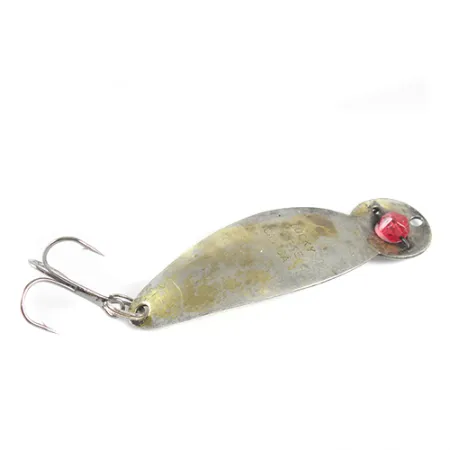 Estampillée « LUCKY STRIKE CANADA » sur le revers, cette cuillère ondulante vintage en métal illustre le savoir-faire classique d'un légendaire fabricant nord-américain. Une perle de verre rouge facettée est solidement fixée à la tête du leurre, offrant un point de mire visuel à fort contraste. Mesurant 7 cm pour un poids de 12 g, le corps présente une finition argentée / plaqué or où le métal bicolore est visible sur son profil incurvé. La forme en goutte d'eau transitionne vers une section supérieure circulaire qui abrite l'attache de ligne et le joyau rouge emblématique. Identifié par le code 1527, cet exemplaire affiche un état de 4/5, montrant des signes d'âge authentiques tout en conservant son intégrité fonctionnelle. L'armement comprend un hameçon triple robuste fixé par un anneau brisé à la queue, prêt pour le lancer ou la traîne.