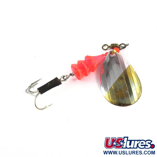 Mesurant 8,25 cm (3 1/4 pouces) de l'émerillon à la courbure de l'hameçon, cette cuillère tournante classique fabriquée au Canada se distingue par sa palette en forme de larme. Le placage à double finition sur l'avant de la palette est divisé entre le nickel poli et le laiton, tandis que le verso présente un revêtement rouge uni. Lucky Strike, un incontournable de l'histoire du matériel de pêche canadien, a produit la Coffee Spoon (code produit 2595) avec un profil léger de 7 g (1/4 oz) adapté à diverses espèces d'eau douce. Un corps en plastique étagé orange translucide constitue un point focal visuel le long de l'armature métallique, menant à un hameçon triple équipé d'une gaine de protection noire. Ce spécimen conserve un état de 4/5, affichant des finitions bien préservées et des composants propres. Un émerillon baril en laiton est déjà fixé à l'œillet de tête pour faciliter la gestion de la ligne lors des sessions de lancer ou de traîne.