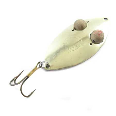 Mesurant 7,5 cm de long, cette cuillère ondulante en laiton représente une époque fascinante de la fabrication canadienne de matériel de pêche. Fixés par des goupilles métalliques, les deux yeux en bois sont une caractéristique remarquable de la Lucky Strike Gold Red Flash, code produit 1840, ajoutant un élément tactile et tridimensionnel au corps en métal estampé. Pesant 21 g, la forte épaisseur du leurre offre une sensation de solidité lors du lancer. Le poinçon du fabricant est clairement visible, frappé au centre de la cuillère entre les détails oculaires. Ce spécimen particulier est dans un état 4/5, présentant des surfaces métalliques bien entretenues et un hameçon triple robuste attaché par un anneau brisé solide. Originaire du Canada, la conception reflète la philosophie de durabilité typique des anciens leurres Lucky Strike. Le corps en laiton assure un éclat constant, tandis que les perles en bois teintées en rouge offrent un contraste visuel unique que l'on ne trouve pas sur les cuillères modernes.