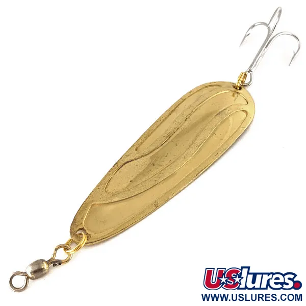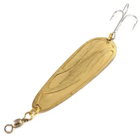Mesurant 9 cm (3 1/2"), cette cuillère métallique à finition dorée incarne le savoir-faire durable typique du matériel Lucky Strike fabriqué au Canada. Le corps lourd de 28 g (1 oz) présente une texture ondulée distinctive pressée dans le métal, servant à capturer et à refléter la lumière sous plusieurs angles une fois immergé. Identifié par le code produit 12479, le leurre est équipé d'un triple robuste de couleur argentée et d'un émerillon baril fixés par des anneaux brisés à chaque extrémité pour une connexion sécurisée. La surface concave intérieure est frappée du poinçon du fabricant, préservant l'identité claire de ce modèle vintage. Notée 5/5, le plaquage or reste exceptionnellement brillant sur toute la surface, témoignant de la finition de haute qualité de la production de la marque.