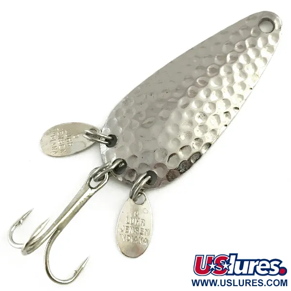 Les finitions en nickel martelé comme celle de cette cuillère Luhr Jensen sont un choix classique pour capter la lumière et créer des reflets. Mesurant 5 cm (2") et pesant 9 g (1/3 oz), cette cuillère fabriquée aux États-Unis est identifiée par le code produit 5814 et se distingue par sa configuration « sonic blade ». Deux petites palettes métalliques ovales sont montées via des anneaux brisés à la base de la cuillère, positionnées à côté de l'hameçon triple pour offrir une surface supplémentaire et un contact métal contre métal. Alors que l'avant du leurre est fortement martelé pour diffuser la lumière, le revers conserve une surface lisse et hautement polie. Les deux palettes sonores sont clairement estampillées de la marque du fabricant, correspondant à l'état général 5/5 de cet objet bien entretenu. L'armature argentée reste brillante et l'hameçon triple ne montre aucun signe d'utilisation.