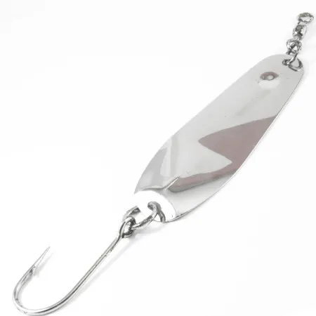 Le nickel poli offre une finition très brillante à cette cuillère métallique de 14g (1/2oz). Produit par Luhr Jensen aux USA sous le code produit 3341, le modèle McMahon reste un choix classique pour les configurations de traîne dédiées. Mesurant 10cm (4") de long, le leurre présente un profil mince et allongé conçu pour la stabilité lorsqu'il est tracté derrière un bateau. L'armement se compose d'un émerillon baril à l'avant pour atténuer la torsion de la ligne et d'un grand hameçon simple attaché via un anneau brisé robuste à l'arrière. Ce spécimen spécifique est en état 5/5, conservant sa surface réfléchissante comme un miroir sans marques ni usure. Luhr Jensen a établi son héritage avec ces modèles en métal estampé, qui utilisent la physique simple pour capter la lumière et attirer l'attention des poissons dans diverses clartés d'eau.