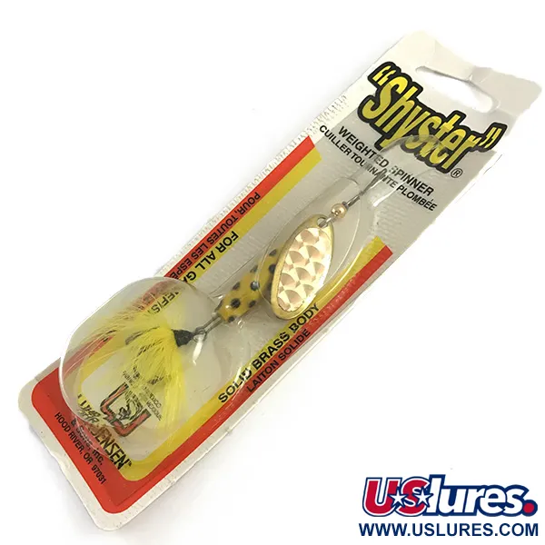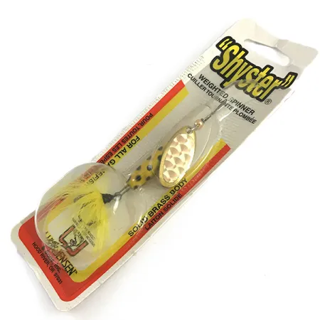 Doté d'un corps jaune vif accentué de points noirs audacieux, ce modèle présente le design lesté classique du Luhr Jensen Shyster. Pesant 9 g (1/3 oz) pour une longueur de 8 cm (3 1/4"), ce leurre est fabriqué en laiton massif pour offrir la densité nécessaire à une bonne stabilité en eaux calmes ou courantes. La palette dorée est texturée pour créer un effet lumineux holographique, associée à un triple à plumes jaunes pour un profil visuel accru. Fabriqué au Mexique, ce modèle identifié par le code 2414-013-0063 est resté inutilisé, conservé dans son emballage de détail vintage d'origine. La boucle décalée à la tête de la tige est une caractéristique technique spécifique conçue par l'entreprise de Hood River, Oregon, pour faciliter la rotation même lors de récupérations lentes.