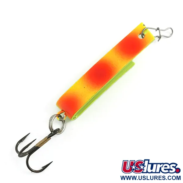 Des points rouges fluorescents sur un fond jaune vif définissent la finition frappante de ce Luhr Jensen Super-Duper 503, un modèle originaire des USA. Mesurant 1 1/2" (3,5 cm) de long, le corps métallique distinctif en forme de "U" est conçu pour une présentation unique qui fait le lien entre une cuillère ondulante et une cuillère tournante. Ce spécimen spécifique, identifié par le code produit 5947, est traité avec un revêtement réactif aux UV qui brille intensément sous la lumière ultraviolette, comme le montre la photographie sur fond noir. Pesant 1/8 oz (4,3 g), le leurre est équipé de son hameçon triple d'origine avec finition bronze et de son agrafe avant. L'état est noté 5/5, la peinture et les composants métalliques conservant leur aspect d'origine.