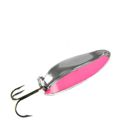 Mesurant 5 cm (2") de long, ce modèle illustre le travail du métal américain classique de la série TODDCO Main Liner, portant le code produit 0392. Cette cuillère présente une finition en nickel hautement poli, accentuée par des rayures rose vif sur la face externe, une combinaison de couleurs conçue pour la visibilité dans diverses clartés d'eau. Pesant 11 g (2/5 oz), son profil robuste est associé à un anneau brisé renforcé et à un hameçon triple piquant, marques de la philosophie de conception utilitaire du fabricant. Ce leurre provenant des États-Unis est dans un état 5/5, affichant une surface propre et brillante sur sa forme en goutte d'eau. Le contraste entre le métal argenté réfléchissant et la peinture rose saturée reste net et bien défini.