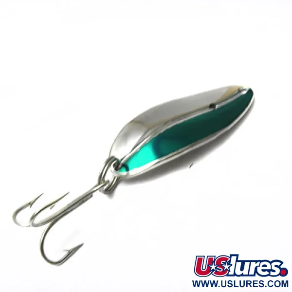 Une finition réfléchissante vert sarcelle saisissante définit un côté de cette cuillère ondulante, contrastant magnifiquement avec le corps nickelé poli. Pesant 11g (2/5oz) et mesurant 5cm (2") de long, cette TODDCO Main liner est une pièce classique de l'artisanat américain des États-Unis. Le corps en métal présente une arête longitudinale distincte estampée au centre, un détail structurel courant sur les cuillères de lancer du milieu du siècle pour assurer la rigidité. Ce spécimen spécifique, répertorié sous le code produit 0454, reste dans un état magnifique avec une note de 5/5, affichant une surface brillante et propre tant sur le nickel que sur l'éclat coloré. L'armement se compose d'un unique hameçon triple piquant fixé par un anneau brisé robuste, prêt pour la pêche ou l'exposition. Un petit œillet de fixation est proprement percé à la tête, maintenant le profil profilé du coloris Nickel / Green.