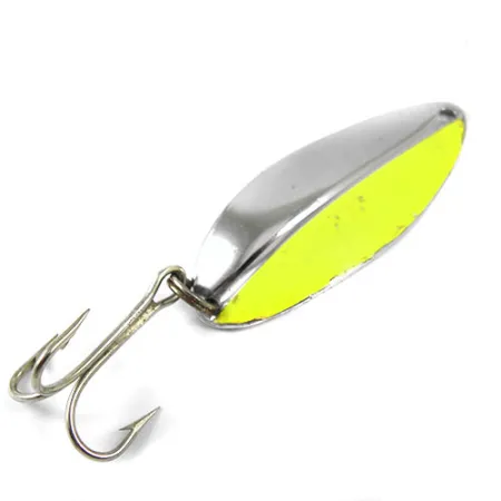 Partiellement revêtue d'un vert fluorescent vibrant sur une finition nickel brillante, cette cuillère Main liner de TODDCO représente une approche classique des leurres attracteurs. Mesurant 5,5 cm (2 1/4"), ce spécimen de fabrication américaine présente le design simple et efficace qui a défini l'équipement utilitaire du milieu du siècle dernier. Le leurre pèse 14 g (1/2 oz), offrant un poids substantiel pour les lancers à longue distance. Sur le devant, le corps en nickel est accentué par une application diagonale de peinture vert fluorescent, tandis que le dos concave révèle une arête structurelle proéminente pour plus de rigidité. Un seul anneau brisé relie un triple piquant à la queue. Identifié par le code produit 0790, ce leurre reste dans un état 4/5, affichant des surfaces bien préservées et une finition métallique propre. La combinaison d'un placage à fort éclat et d'une peinture haute visibilité a été spécifiquement conçue pour les pêcheurs devant prospecter des eaux teintées ou des environnements à faible luminosité.