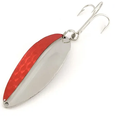 Une texture martelée recouvre exactement la moitié de la palette de cette cuillère de 21 g (3/4 oz), créant un profil visuel très contrasté. Connue sous le nom de Main Liner de chez TODDCO, code produit 21487, ce leurre de 6,5 cm (2 1/2") illustre parfaitement la fabrication américaine de matériel de pêche de l'époque antérieure à 1980. Le coloris présente une séparation nette entre le nickel poli et un rouge profond, le côté rouge offrant une surface martelée qui apporte une profondeur physique au métal. Elle est équipée d'un hameçon triple piquant et d'un anneau brisé robuste, tandis qu'un simple perçage à l'avant sert de point d'attache. Ce spécimen particulier conserve une finition exceptionnellement propre, avec un état évalué à 5/5. Sa construction en métal estampé est équilibrée pour une utilisation polyvalente, que ce soit au lancer ou à la traîne.