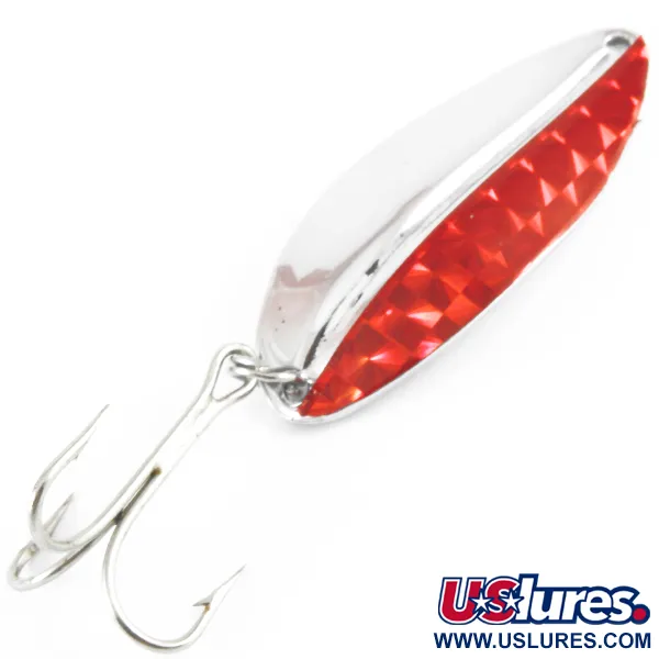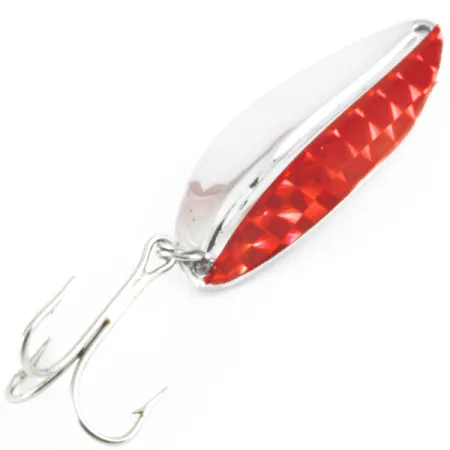 Pesant 12,5 g (2/5 oz), cette cuillère ondulante américaine vintage témoigne du savoir-faire de TODDCO, un fabricant qui a cessé sa production aux USA vers 1980. Un insert rouge vif à motif diamant crée un contraste visuel net avec le corps en nickel poli, qui mesure 5,5 cm (2 1/4") de long. Cette Main liner, identifiée par le code 3671, présente une silhouette classique en forme de larme avec un revers concave net et un seul œillet de fixation à l'extrémité étroite. L'armement comprend un hameçon triple argenté fixé par un anneau brisé. Cet exemplaire est en état 5/5, montrant une finition métallique bien conservée et un ruban rouge prismatique solidement fixé.