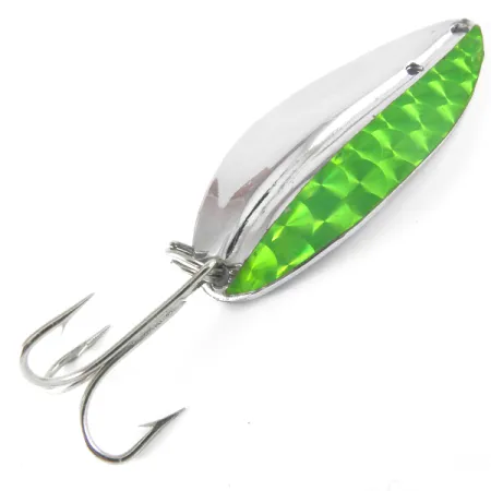 Revêtue d'une finition nickel brillant et d'une bande prismatique verte distinctive, cette cuillère ondulante représente le savoir-faire du milieu du siècle de la société américaine TODDCO. Mesurant 5,5 cm (2 1/4") et pesant 12,5 g (2/5 oz), la Main liner présente une forme de goutte conçue pour le lancer et la traîne. Ce modèle spécifique, portant le code produit 3737, arbore un motif d'écailles réfléchissantes sur une face, tandis que le revers reste en nickel poli et lisse. Produits jusqu'en 1980, ces leurres sont un incontournable pour ceux qui apprécient l'histoire du matériel de pêche américain. L'armement comprend un triple robuste et brillant fixé par un anneau brisé à la queue. Dans son état actuel noté 5/5, le leurre présente une surface magnifiquement préservée où l'insert prismatique vert est fermement fixé et conserve son éclat d'origine.