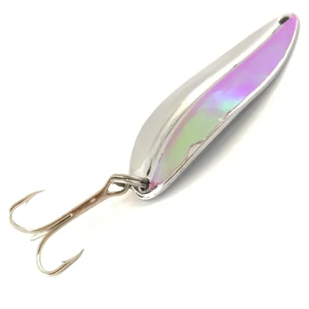 Le placage en nickel associé à un insert irisé Purple and Green Pearl confère à cette cuillère un profil visuel distinct qui reflète la lumière différemment sous tous les angles. Ce TODDCO Main liner, identifié par le code produit 4704, mesure 5,5 cm (2 1/4") et a été fabriqué aux USA avant que la société ne cesse sa production vers 1980. Pesant 12,5 g (2/5 oz), ce leurre est conçu pour les applications de lancer et de traîne nécessitant une forte présence métallique. L'armement comprend un hameçon triple piquant fixé par un anneau brisé, assurant une grande durabilité lors de la récupération. Conservé dans un état exceptionnel, le fini est brillant et l'insert en nacre reste intact, méritant une note de condition de 5/5. Une petite ouverture nette au nez sert de point d'attache principal pour une agrafe ou un bas de ligne.