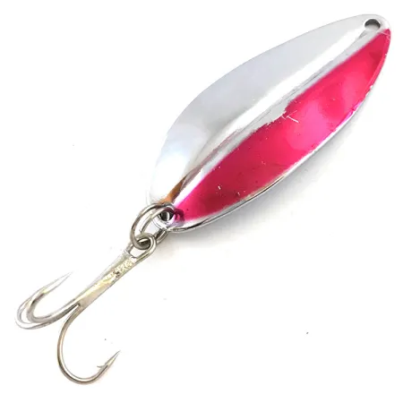 Un poids distinctif de 2/5 oz (12,5 g) confère au Main liner de TODDCO sa substance pour le lancer et la traîne. Ce spécimen particulier, répertorié sous le code 5244, présente un design américain classique d'un fabricant qui a produit ces leurres aux États-Unis jusqu'en 1980. Mesurant 2 1/4" (5,5 cm) de long, cette cuillère arbore un coloris Nickel / Rouge frappant où un côté est divisé entre un nickel poli brillant et une bande translucide rouge-rose vibrante. Le revers conserve une finition nickel propre et uniforme avec une arête centrale proéminente qui assure l'intégrité structurelle du corps métallique. L'armement se compose d'un hameçon triple piquant fixé par un anneau brisé à la queue. Le leurre est en condition 5/5, conservant son éclat métallique d'origine et la qualité de sa peinture.
