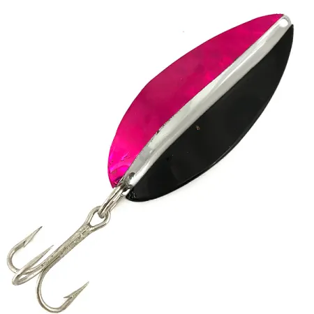 Un poids de 21 g (3/4 oz) confère au Toddco Main Liner une densité substantielle pour la traîne en eau profonde ou les lancers à longue distance. Cette cuillère en forme de feuille de saule de 6,5 cm (2 1/2") présente une séparation de couleur nette et longitudinale sur la face avant, avec un côté rouge foncé métallisé contrastant avec une moitié noire unie. Une jointure en nickel poli court au centre, reflétant la finition nickel complète au dos du métal. Identifié par le code produit 7337, ce leurre de fabrication américaine représente une époque classique de la production Toddco qui s'est achevée en 1980. L'armement se compose d'un hameçon triple piquant fixé par un anneau brisé, et l'état général est noté 5/5. L'œillet matricé sur le dessus est proprement percé pour des attaches directes ou des agrafes.