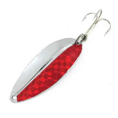 Les finitions nickelées et rouges définissent l'esthétique de cette cuillère américaine vintage produite par Toddco. Identifiée par le code produit 9377, la Main liner présente une arête longitudinale distincte au centre de sa palette, assurant une stabilité structurelle. Mesurant 5,5 cm de long et pesant 12,5 g, le leurre se compose d'un corps métallique en forme de feuille avec un placage en nickel brillant sur une moitié et un autocollant holographique rouge à damier sur l'autre. Ce spécimen reflète le savoir-faire de l'époque précédant l'arrêt de la production de Toddco vers 1980 et conserve une note d'état de 5/5. L'armement comprend un anneau brisé argenté d'origine relié à un hameçon triple standard, tandis que la tête est équipée d'un point d'attache unique pour un bas de ligne ou une agrafe.