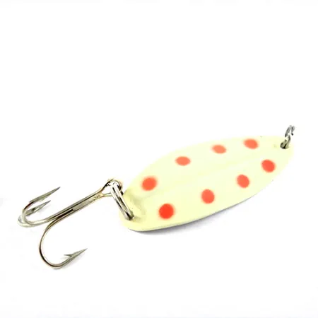 Pesant 12,5 g (2/5 oz), le corps métallique présente une rainure longitudinale caractéristique le long du dos, un détail technique indissociable du fabricant américain TODDCO aujourd'hui disparu. Ce spécimen Main liner Glow, portant le code produit 2839, mesure 5,5 cm (2 1/4") et arbore une face blanche luminescente ornée de huit points rouges distincts. Le revers révèle une finition en nickel poli, ajoutant un élément réfléchissant au design phosphorescent. L'armement est remarquablement propre, comprenant un hameçon triple et un anneau brisé d'origine. Noté 5/5, la peinture et le placage témoignent du soin apporté à cette cuillère ondulante vintage au fil des ans. Ses propriétés phosphorescentes ont été spécifiquement conçues pour une visibilité par faible luminosité ou dans les couches d'eau profondes.