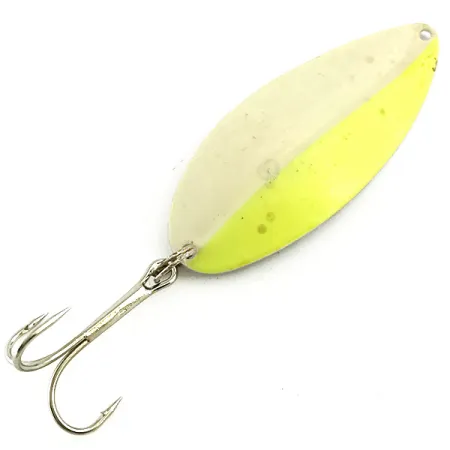 Divisée en diagonale entre le blanc et le jaune fluorescent sur la face avant, cette cuillère vintage témoigne des standards de fabrication américains classiques de la marque TODDCO d'avant 1980. Pesant 3/4 oz (21 g) et mesurant 2 1/2" (6,5 cm) de long, la Main liner Glow UV a été conçue pour une visibilité accrue en eaux profondes ou troubles. La finition est spécifiquement élaborée pour être phosphorescente et réagir aux rayons UV, offrant un profil distinct pour le lancer ou la traîne. Le revers du leurre révèle un dos en nickel poli avec une arête centrale structurelle sur toute la longueur du corps. Répertorié sous le code 5698, ce spécimen est en état 4/5, conservant sa peinture vive et ses composants d'origine, notamment un anneau brisé robuste et un hameçon triple piquant. De légères marques de surface sur le côté peint reflètent son passé de véritable vestige de l'histoire de la pêche aux États-Unis.