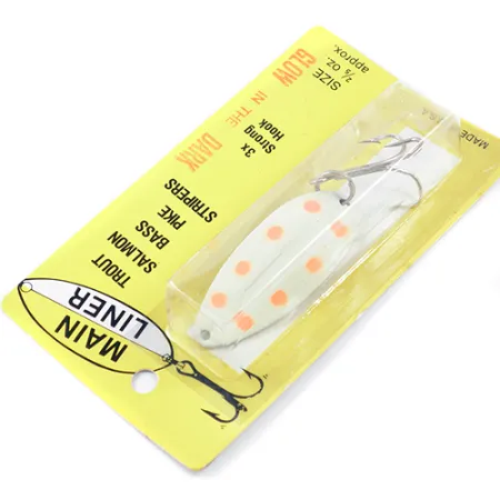 Des points orange se détachent sur la base blanche phosphorescente de cette cuillère Toddco Mainliner vintage. Répertorié sous le code produit 1892, ce leurre de 5 cm (2 pouces) de Toddco Products (Grand Rapids, Michigan) est conçu pour la traîne profonde ou le lancer. Cet exemplaire est à l'état neuf dans son emballage d'origine, bien qu'une fine fissure soit visible dans la finition de la peinture centrale. D'un poids de 11 g (2/5 oz), la cuillère est armée d'un hameçon triple 3x fort, spécifiquement adapté au saumon, au brochet et au bar rayé. La finition phosphorescente était un incontournable pour les pêcheurs opérant par faible luminosité ou dans les couches d'eau profondes où la visibilité est limitée.