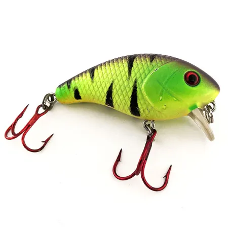 Les motifs Fire Tiger comme celui de ce corps de 6 cm (2 1/4") restent incontournables pour les conditions de forte visibilité nécessitant une présentation audacieuse. Pesant 7 g (1/4 oz), ce spécimen de la Mann's Bait Company est un shallow-runner spécialisé, conçu pour rester à moins de 0,3 m (1 ft) de la surface pendant la récupération. Identifié sous le code produit 11738, ce leurre possède une bavette carrée en plastique transparent distinctive et un corps flottant à haute flottabilité. La finition est en état 5/5, présentant un flanc chartreuse vif contrastant avec un dos violet foncé, marqué de barres verticales noires prononcées. Des hameçons triples rouges sont fixés via des anneaux brisés robustes, offrant un contraste marqué avec l'armement du ventre. Ce Baby 1-Minus fabriqué aux USA inclut des yeux rouges proéminents et une texture d'écailles détaillée sur la partie supérieure du corps. C'est un exemple bien conservé des crankbaits à petit gabarit qui ont établi la réputation du fabricant de l'Alabama pour les présentations de surface.