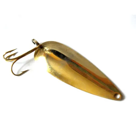 Le corps en laiton confère à ce leurre de 14 g (1/2 oz) une présence en main immédiatement identifiable par tout pêcheur chevronné. Mesurant exactement 7 cm (2 3/4 pouces), la cuillère Marathon présente un profil en forme de goutte d'eau, conçu pour le lancer ou la traîne en eau douce comme en mer. Produit sous la marque Marathon aux États-Unis, le corps métallique porte l'estampille distincte du fabricant sur sa face concave. L'armement se compose d'un hameçon triple robuste fixé par un anneau brisé fiable, respectant le montage d'usine original. Comme cet exemplaire est neuf (État 6), les surfaces en laiton conservent leur éclat d'origine sans aucune trace d'utilisation. Le code 0000 identifie cet exemplaire spécifique au sein d'une collection sélectionnée.