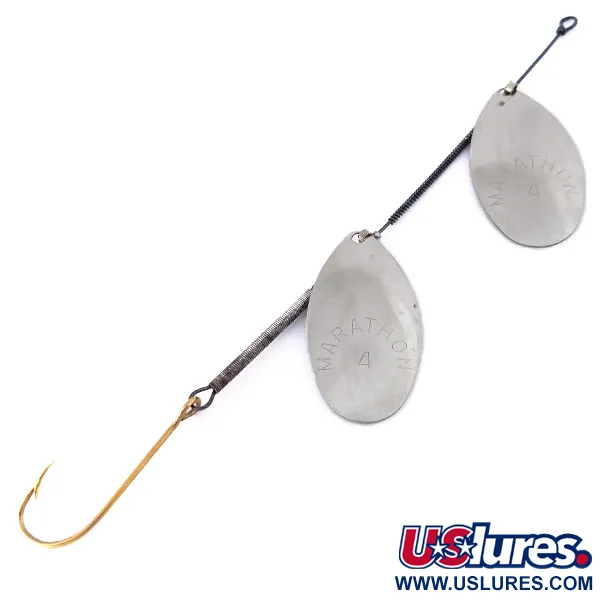 Deux palettes en forme de goutte d'eau estampillées du chiffre 4 caractérisent cette cuiller tournante nickelée classique de la Marathon Bait Company. Mesurant 15 cm (6") de longueur totale, ce spécimen, identifié par le code produit 10476, présente une finition nickel brillant qui reste remarquablement propre. Pesant 7 g (1/4 oz), le leurre est construit sur une armature en corde à piano sombre terminée par un hameçon simple doré. une petite perle rouge translucide est positionnée entre les étriers, offrant un subtil point de contraste visuel par rapport aux composants métalliques. Ce matériel fabriqué dans le Wisconsin représente l'ère du milieu du siècle d'un fabricant qui a opéré de 1929 à 1979. L'armature est en excellent état, notée 5/5, montrant la nature bien conservée du fil et la définition nette des marquages sur les palettes. Chaque composant, des ligatures de l'armature à l'assemblage à double palette, est typique des conceptions durables produites au cours des 50 ans d'histoire de l'entreprise dans le Midwest américain.