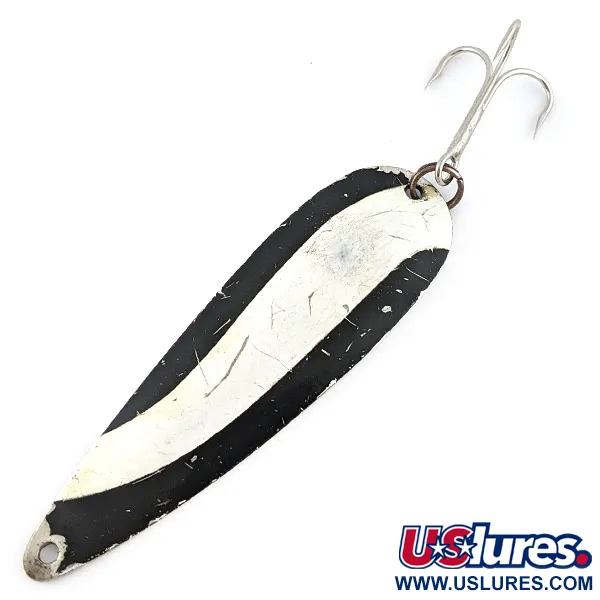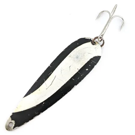 Des rayures diagonales noires et blanches sur une base en nickel poli offrent un profil visuel très contrasté à cette cuillère de 9 cm (3 1/2"). Le nom de la marque Marathon est directement gravé dans le métal au revers, identifiant ce leurre comme une pièce classique de l'histoire du matériel de pêche américain. Avec un poids de 21 g (3/4 oz), son corps en forme de goutte d'eau est lesté pour atteindre de grandes distances au lancer ou pour maintenir sa profondeur lors de la traîne. La face peinte présente des sections ondulées noires et blanches qui contrastent avec les bords en nickel brillant. Ce leurre spécifique, référencé sous le code produit 22580, est en état 4/5, présentant quelques manques de peinture et des marques de surface dues à une utilisation antérieure. L'armement comprend un large hameçon triple fixé par un anneau brisé à l'arrière, tandis que la tête dispose d'un point d'attache unique pour le fil ou un émerillon.