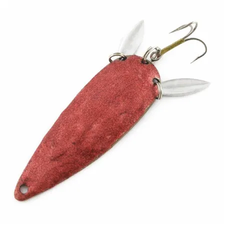 Pesant 17 g (3/5 oz), cette cuillère Marathon présente une finition rouge pailletée texturée qui contraste avec son revers métallique poli. Mesurant 7,5 cm (3"), sa conception inclut deux palettes feuilles de saule argentées fixées à des anneaux brisés près de la queue, un dispositif astucieux pour ajouter des reflets et masquer l'hameçon triple. Ce modèle spécifique, code produit 24180, provient de la Marathon Bait Company du Wisconsin, un fabricant prolifique ayant opéré entre 1929 et 1979. Les palettes auxiliaires apportent un attrait visuel supplémentaire à l'arrière du leurre, imitant le mouvement d'une nageoire caudale. Dans son état actuel 4/5, la finition reste éclatante et l'armement est solidement fixé. Les anneaux brisés et l'hameçon triple témoignent de la durabilité typique du matériel de pêche américain du milieu du siècle.