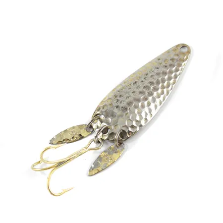 Une finition en or martelé définit la face de cette cuillère ondulante de 6 cm (2 1/4"), un design classique de la Marathon Bait Company. Identifié par le code 2772, ce leurre se distingue par ses 'Sonic Blades' — deux petites gouttelettes métalliques fixées à l'anneau brisé arrière qui offrent un éclat supplémentaire aux côtés de l'hameçon triple doré. Pesant 12 g (2/5 oz), le corps en métal massif présente un intérieur lisse et poli où le nom du fabricant est estampillé dans une police sans empattement épurée. L'état est évalué à 4/5, montrant une surface bien entretenue qui conserve son éclat d'origine et son intégrité structurelle. Un seul trou de montage à l'extrémité étroite permet une attache directe de la ligne ou d'une agrafe, typique du matériel du milieu du siècle trouvé dans de nombreuses boîtes de pêche des Grands Lacs.