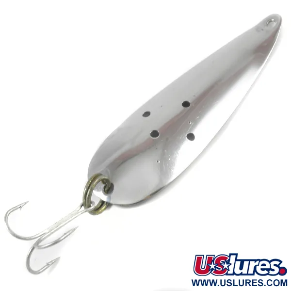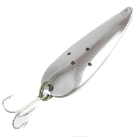 Une finition en nickel poli offre une surface à haute réflexion à cette cuillère métallique vintage, conçue pour le lancer profond ou la traîne. Pesant 18 g (2/3 oz) et mesurant 9,5 cm (3 3/4"), le corps présente quatre perforations spécifiques au centre, un choix technique unique de la Marathon Bait Company. Ce fabricant basé dans le Wisconsin a opéré de 1929 à 1979, et ce spécimen particulier, répertorié sous le code produit 3224, reflète la fabrication américaine robuste de cette époque. L'armement se compose d'un anneau brisé solide et d'un hameçon triple brillant, le tout restant dans un état 5/5. L'estampille du fabricant ist clairement visible sur la face concave du leurre, affirmant son héritage auprès des collectionneurs de matériel de pêche du milieu du siècle.