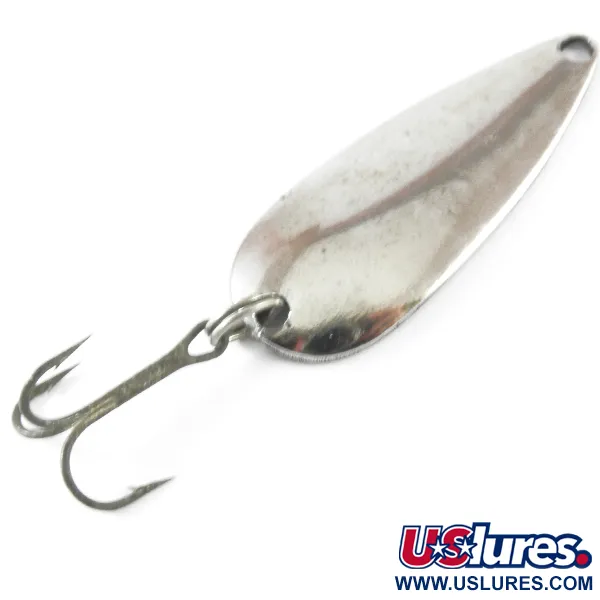 Clairement estampillé sur la face intérieure concave, le nom Marathon identifie cette cuillère ondulante classique comme une pièce de l'histoire de la pêche du Wisconsin de la Marathon Bait Company. Pesant 3/16 oz (5,5 g) pour une longueur de 1 3/4" (4,5 cm), ce leurre à finition nickelée est un choix polyvalent pour le lancer léger ou la traîne. Ce spécimen, identifié par le code produit 3716, illustre le design simple mais efficace en forme de larme produit par l'entreprise entre 1929 et 1979 aux États-Unis. La surface réfléchissante en nickel reste brillante, et l'armement comprend un hameçon triple robuste fixé par un anneau brisé durable à la base. Noté 5/5, le métal présente une finition propre, conservant l'éclat original de sa fabrication du milieu du siècle. Un petit œillet de fixation à l'extrémité étroite permet une attache sécurisée pour une agrafe ou un nœud direct.