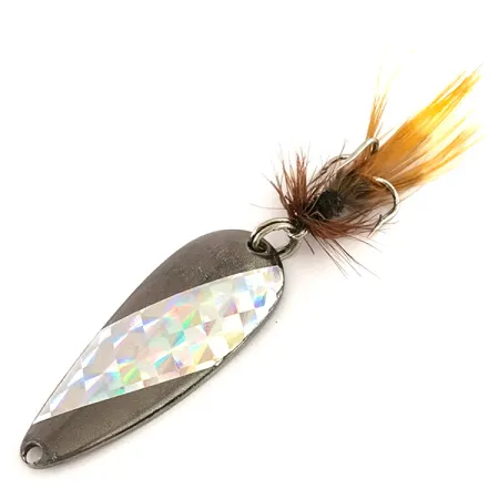 Pesant exactement 1/4 oz (7 g), cette cuillère ondulante en forme de goutte présente une finition gris foncé métallisé contrastée par un insert holographique à motif de losanges. Marathon Bait Company, qui a opéré dans le Wisconsin de 1929 à 1979, a gravé son nom lisiblement au dos du corps de 1 3/4" (4,5 cm). Identifié par le code produit 7529, le leurre est équipé d'un hameçon orné d'un habillage bien conservé de plumes brunes et jaunes. L'état est excellent, noté 5/5, révélant la clarté d'origine du ruban prismatique. Ce spécimen fabriqué aux USA conserve son armature d'origine et son montage de plumes d'usine, reflétant les standards de fabrication de son époque.
