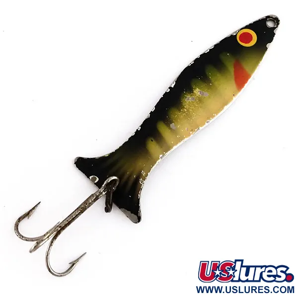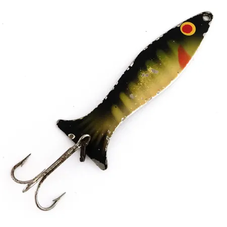 Mesurant 3 1/4" (8 cm) de long, cette cuillère ondulante présente le profil emblématique qui a marqué les cinquante ans de production de la Marathon Bait Company à Wausau, Wisconsin. Le revers en nickel poli est estampillé du nom « MARATHON MUDMINO », contrastant fortement avec le motif perche peint sur le devant. Ce motif spécifique utilise un dos vert foncé avec des barres noires verticales et une tache branchiale rouge vif pour imiter le fourrage local. Pesant 12 g (2/5 oz), le leurre présente une conception à queue évasée qui abrite un hameçon triple unique. Identifiées par le code produit 9938, les surfaces peintes présentent une légère usure sur le périmètre, ce qui lui vaut une note d'état de 4/5.