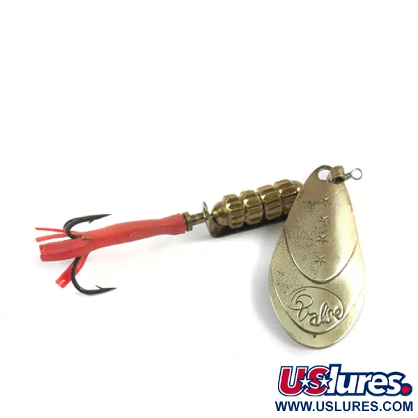 Estampillée des marques « BREVETE SGDG » et « MADE IN FRANCE » au dos de sa palette, cette cuiller tournante du milieu du siècle illustre le savoir-faire français de haute qualité commandé par la société américaine Marathon dans les années 1950. La Marathon Valse, identifiée par le code produit 2970, arbore une teinte laiton massif sur l'ensemble de sa structure, de la palette en forme de goutte d'eau au corps lesté à quatre étages. D'une longueur de 7,5 cm (3") et d'un poids de 12 g (2/5 oz), elle offre une masse substantielle pour le lancer. La palette présente trois étoiles gaufrées au-dessus d'un logo « Valse » à l'écriture soignée, signature esthétique de ce modèle spécifique. Une gaine en plastique rouge vif recouvre la hampe de l'hameçon triple, créant un point d'attaque pour les carnassiers suiveurs. Présenté dans un état 4/5, ce leurre affiche une usure très minime, conservant une finition propre sur les composants métalliques et l'armature d'origine. La palette, montée sur cavalier, est conçue pour tourner autour de l'axe central, associée à un corps segmenté qui assure un profil équilibré lors de la récupération.