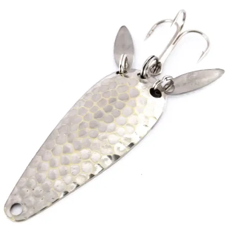 Le placage en nickel martelé capte la lumière sur la surface alvéolée de cette cuillère ondulante de 6 cm (2 1/4"). Montées près de l'hameçon triple affûté se trouvent deux petites palettes soniques allongées qui pivotent sur des anneaux brisés. Ces pétales supplémentaires servent un objectif visuel précis, masquant l'armature tout en créant l'apparence d'une nageoire caudale en mouvement. Ce spécimen arbore le poinçon « MARATHON » estampillé sur son revers poli, un clin d'œil au fabricant basé dans le Wisconsin qui a opéré pendant cinq décennies à partir de 1929. Pesant 12 g (2/5 oz), le leurre offre une densité importante pour la précision du lancer. Identifiée par le code produit 10044, la cuillère conserve son éclat d'origine et son intégrité structurelle, reflétant une note d'état de 5/5.