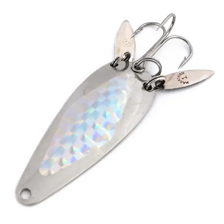 Pesant 12 g (2/5 oz), cette cuillère ondulante nickelée de 6 cm (2 1/4") présente une feuille holographique à motif de losanges frappante sur sa face convexe. La Marathon Bait Company, un fabricant basé au Wisconsin actif de 1929 à 1979, a conçu ce modèle spécifique (code produit 10276) avec deux « sonic blades » fixées à l'anneau brisé arrière. Ces mini-lames minces sont destinées à fournir un éclat supplémentaire et un mouvement subtil autour de l'hameçon triple, masquant efficacement le montage terminal tout en ajoutant un élément visuel secondaire. Le dos du spécimen est clairement estampillé du nom Marathon et présente une finition hautement réfléchissante. Ce leurre reste en condition 5/5, conservant son lustre d'origine sur les surfaces métalliques et l'autocollant à facettes. Les petites lames secondaires sont estampillées du numéro 1, indiquant leur taille par rapport au corps principal de la cuillère.
