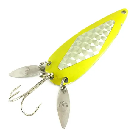 Une peinture jaune fluorescente recouvre le corps de cette cuillère de 7,5 cm (3"), offrant une grande visibilité pour cibler les espèces dans les eaux profondes ou teintées. Pesant 17 g (3/5 oz), le leurre présente un insert en nickel diamant texturé conçu pour refléter la lumière, tandis que la finition jaune réagit avec un éclat distinct lorsqu'elle est exposée aux UV. La Marathon Bait Company, installée dans le Wisconsin de 1929 à 1979, a incorporé deux petites palettes « sonic blades » en forme de feuille de saule à l'arrière du leurre. Ces palettes en finition nickel masquent l'hameçon triple argenté et fournissent un flash supplémentaire lors de la récupération. Ce spécimen, identifié par le code produit 6260, est dans un état 5/5 avec tout son accastillage d'origine. Les marquages estampillés sur les palettes confirment son origine de la gamme Marathon Bait Company.