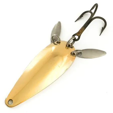 Le métal doré constitue la base de cette cuillère ondulante de 6 cm (2 1/4"), un bel exemple de l'artisanat américain du milieu du siècle. Deux palettes sonores argentées sont montées sur l'anneau brisé arrière à côté de l'hameçon triple, conçues pour capter la lumière et stimuler visuellement la zone d'attaque. Le nom Marathon est clairement estampillé sur la face concave intérieure, marque d'une entreprise du Wisconsin qui a dominé la production de matériel de pêche de l'État de 1929 à 1979. Ce spécimen particulier, identifié sous le code produit 6286, pèse 12 g (2/5 oz) et reste dans un état 5/5. Sa conception présente un œillet large au nez, adapté aux nylons de fort diamètre ou aux bas de ligne en acier. L'armement plus sombre de l'hameçon triple offre un contraste saisissant avec l'or poli du corps de la cuillère.