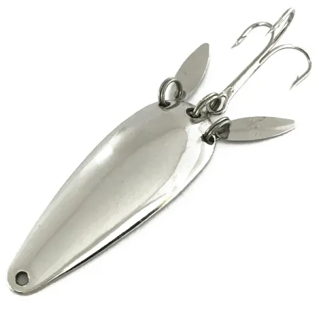 Un placage en nickel poli recouvre l'intégralité du corps de 6 cm (2 1/4") de cette cuillère vintage, véritable marque de fabrique du savoir-faire de la Marathon Bait Company durant ses cinquante ans d'existence dans le Wisconsin. Pesant 12 g (2/5 oz), ce leurre présente une configuration d'armement unique où deux petites palettes sonores en forme de larme sont fixées via des anneaux brisés près de l'hameçon. Ces palettes auxiliaires ont un double objectif : ajouter des reflets supplémentaires au profil tout en masquant partiellement le grand hameçon triple pour mieux imiter l'apparence d'un poisson fourrage en fuite. Identifié par le code produit 7269, ce modèle spécifique illustre l'ingénierie astucieuse qui a fait de Marathon un fabricant américain dominant entre 1929 et 1979. Son état est un solide 5/5, les surfaces métalliques restant brillantes et les détails frappés bien nets. Un trou d'attache unique, percé proprement à l'extrémité étroite, complète ce design en forme de goutte, destiné au lancer ou à la traîne dans diverses conditions d'eau douce.