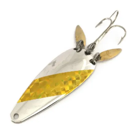 Arborant une bande diagonale holographique dorée distinctive sur son corps en nickel poli, cette cuiller ondulante vintage illustre les designs créatifs de la Marathon Bait Company. Basé dans le Wisconsin de 1929 à 1979, le fabricant a équipé ce modèle 7546 d'une configuration unique à double palette à l'arrière. Deux petites palettes de type feuille de saule, de couleur dorée, sont fixées à l'anneau brisé à côté de l'hameçon triple, ajoutant des points de réflexion lumineuse supplémentaires à la queue. Avec un poids de 12 g (2/5 oz) et une longueur de 6 cm (2 1/4"), ce leurre reste dans un excellent état 5/5, la bande réfléchissante et la finition métallique paraissant extrêmement bien conservées. Le revers du métal estampé présente une surface argentée propre et lisse, caractéristique du matériel de pêche fabriqué aux États-Unis à cette époque.